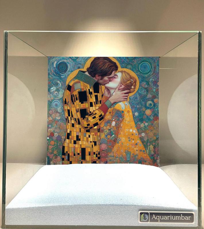 Изображение представляет собой репродукцию картины «Поцелуй» Густава Климта. Стиль изображения идентичен оригиналу, с характерной мозаичной техникой, использующей золотые и желтые цвета. Цветовая гамма содержит сочетание золотистых, желтых, синих и коричневых тонов. Создается впечатление плоской поверхности. Композиция изображает поцелуй двух людей. Используется техника, которая напоминает мозаику. Представленное изображение, вероятно, является принтом или цифровым воспроизведением картины, а не самой картиной в оригинальной технике.