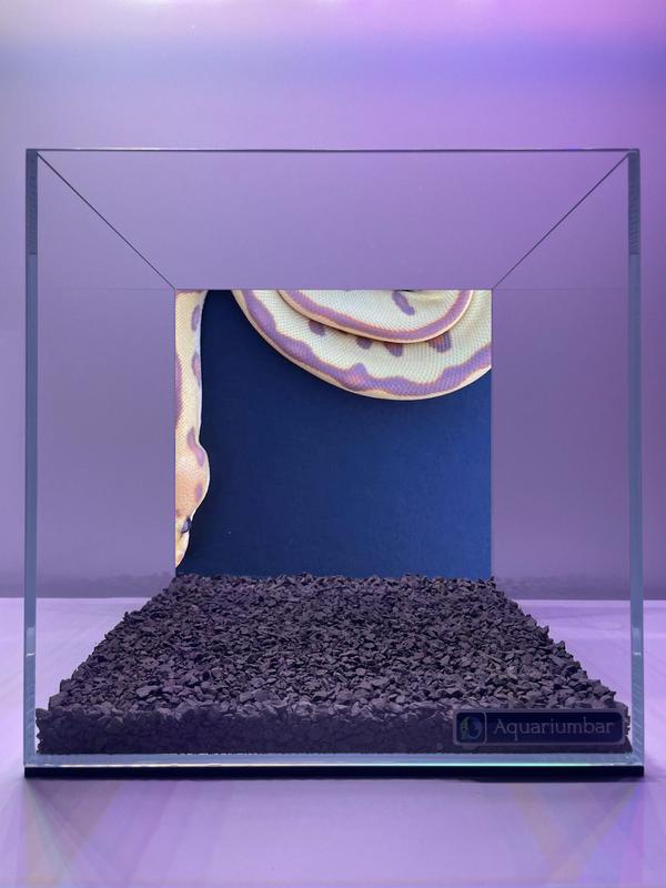 На фото изображен аквариум с темно-синим фоном и змеей, расположенной в нём. Композиция изображения простая и лаконичная. Аквариум занимает весь центр кадра, а змея находится в верхней части. Аквариум имеет прямоугольную форму, а его стенки прозрачные. На дне аквариума виден слой тёмно-серых камней. Фон, окружающий аквариум, имеет нежный фиолетовый оттенок. Основной темой является змея, которая расположена по диагонали аквариума. У змеи есть полосатые узоры на теле. Змея выглядит спокойной и неподвижной. Фотография выполнена в формате цифрового изображения. Цвет изображения яркий и насыщенный, цвета контрастные. Иллюстрация имеет минимальное использование визуальных элементов и фокусируется на змее. В аквариуме присутствует простой, но выдержанный дизайн. На заднем плане аквариума -- темно-синий фон, создающий контраст с белым аквариумом. Свет в кадре равномерный и мягкий, нет явных теней. Цветовая палитра преобладает спокойными тонами. Общая атмосфера фотографии -- спокойная и умиротворенная.
