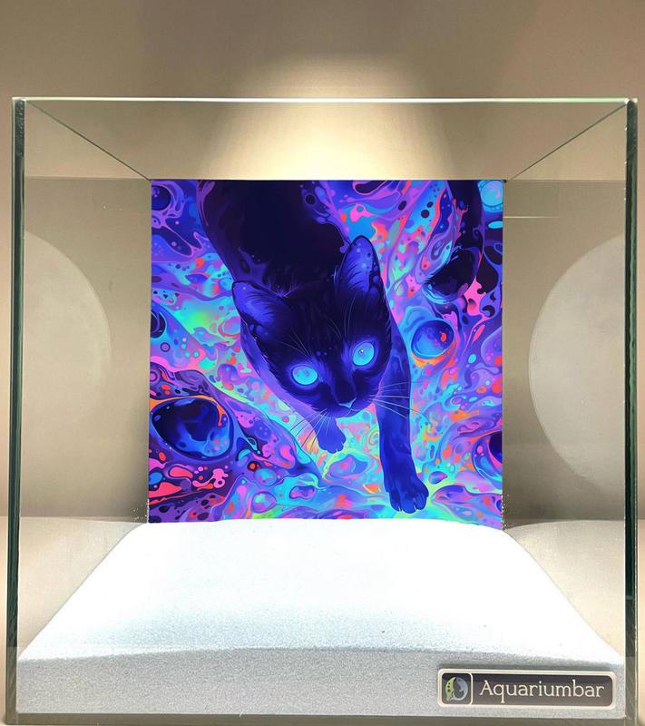 На изображении изображена аквариумная наклейка с изображением черной кошки на ярком абстрактном фоне в стиле трип-хоп. Композиция изображения сосредоточена на изображении черной кошки, которая динамично изображена на фоне. Кошка находится в центре наклейки и смотрит в сторону. Фон наклейки представляет собой смесь ярких цветов, таких как розовый, голубой, фиолетовый и фиолетовый, с абстрактными узорами и эффектами в стиле трип-хоп. Главным объектом является черная кошка, с выразительными голубыми глазами, которая нарисована в движении. У кошки гладкая шерсть и форма тела, соответствующая кошкам. Ее поза динамичная, как будто она бежит или прыгает. Иллюстрация выполнена в цифровом формате, демонстрирующем современные цифровые художественные техники. Стиль рисунка яркий и абстрактный, с использованием широкой палитры цветов и форм. Цвет кошки контрастирует с окружающим ее абстрактным фоном. На изображении изображен аквариум с белой основой, вокруг которого находится белая поверхность. Окружающая среда изображения, созданная с помощью наклейки, имеет яркие и абстрактные тона. Освещение на изображении не направлено на предмет, но, тем не менее, освещение создает впечатление, как будто оно направляется с левой стороны. Общее настроение изображается динамично и абстрактно, и цвета выглядят яркими.