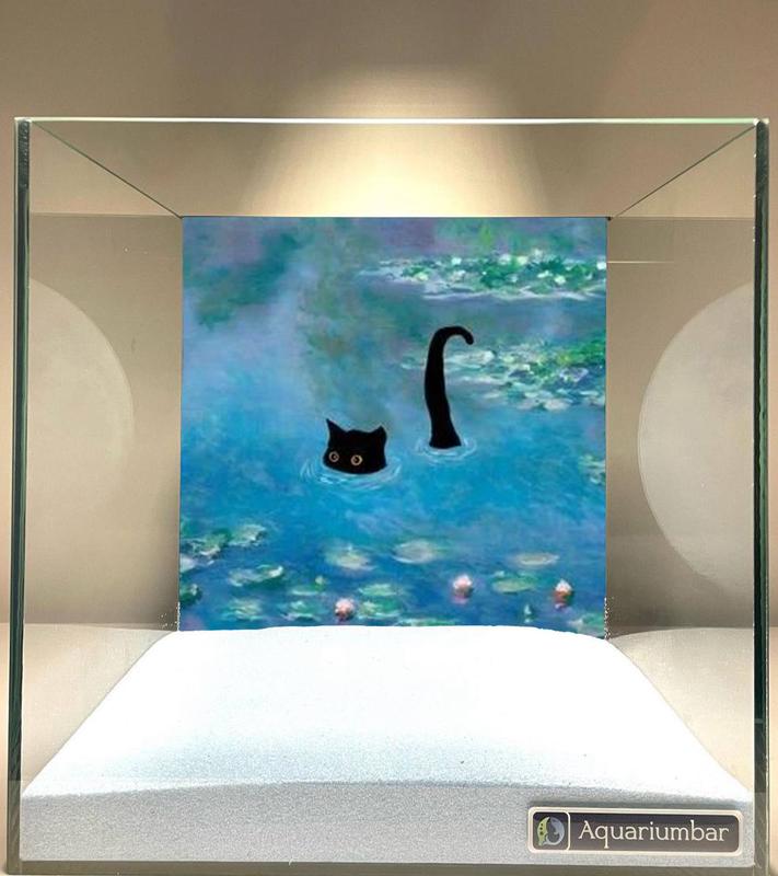 Зображення являє собою акваріум із піском, на стінці якого зображена картина в стилі імпресіонізму. На картині зображений чорний кіт, який плаває у воді з лататтям. Колірна палітра м'яка, з переважанням блакитних, рожевих і бежевих відтінків. Стиль нагадує роботи Моне з його зображенням водних лілій, але з додаванням фігури чорного кота. Манера написання передбачає використання ніжних мазків пензля, характерних для імпресіонізму. Текстура на зображенні згладжена, не виділяється яскраво вираженою фактурою. Композиція картини збалансована і не перевантажена деталями, зосереджена на зображенні кота і квітів. Засіб, що використовується для створення зображення, найімовірніше, цифровий живопис або репродукція картини, можливо, для декоративного акваріума.