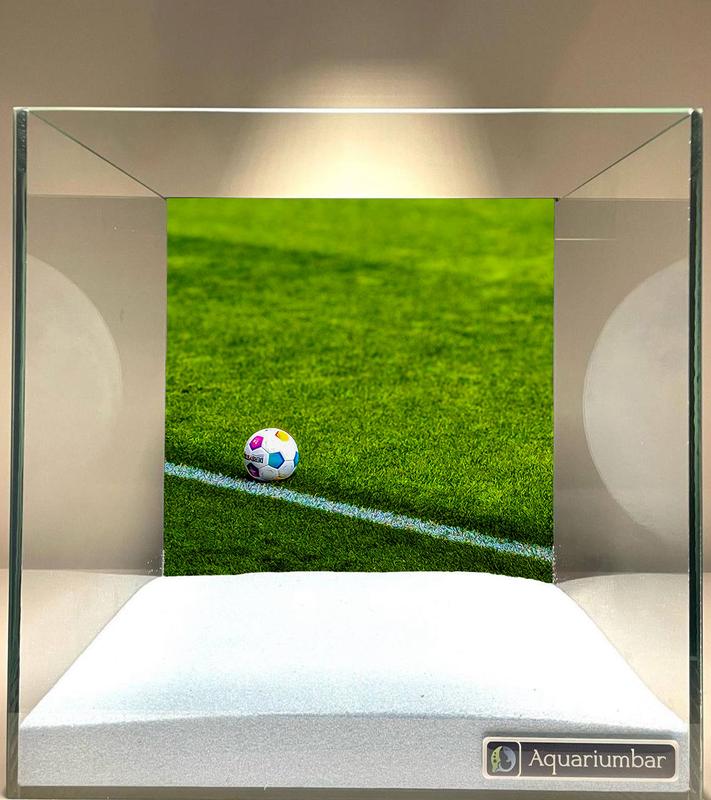 Изображение представляет собой миниатюрную сцену футбольного поля в аквариуме. Стиль изображения - реалистичный, с фокусом на деталях. Используется фотореалистичная текстура искусственной травы для поля и небольшого футбольного мяча. Цветовая палитра спокойная, с преобладанием зелёного цвета травы и белых линий разметки поля. В композиции использована перспектива, создающая ощущение глубины. Материал - скорее всего, аквариумное стекло с подложкой из белого песка. Стиль не относится ни к одному из упоминаемых художественных направлений, а скорее направлен на точную передачу реалистичного вида футбольного поля, миниатюрно выполненного. В целом, изображение отличается реализмом и детализацией.