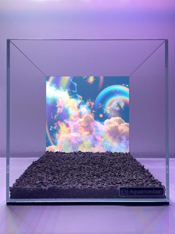 Изображение представляет собой аквариум с оформлением в стиле цифрового фотореализма. В аквариуме изображены радуги, облака и небо, имеющие яркие, пастельные цвета. Композиция аквариума выполнена в стиле, имитирующем абстрактную живопись. Текстура и обработка поверхности аквариума кажутся гладкими, отражающими изображение. Используемые цвета включают в себя пастельные оттенки, такие как розовые, сиреневые, желтые и голубые. Стиль изображения можно охарактеризовать как стилизованный и красочный, с упором на цифровые эффекты. Средство, используемое для изображения, скорее всего, цифровая обработка фотографий. Видно, что изображение представляет собой обработанное фото с акварельным эффектом, а не традиционную живопись.