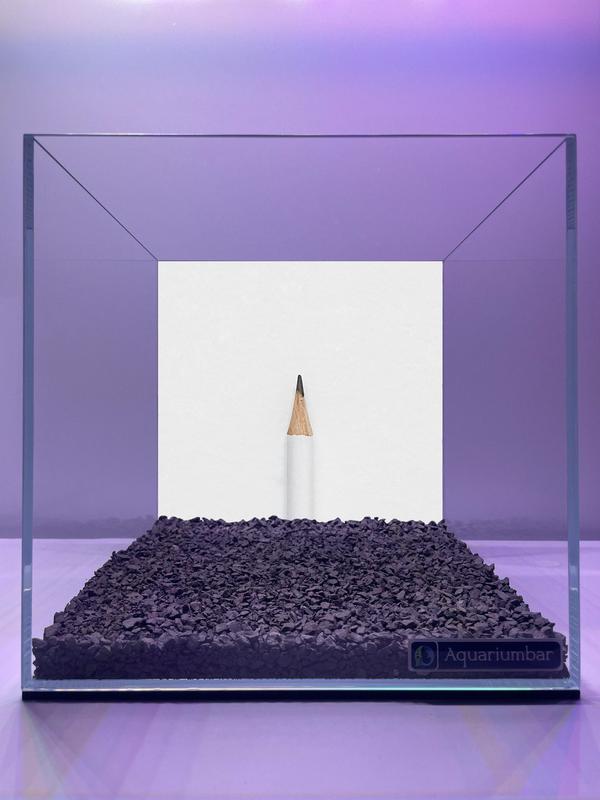 На изображении представлен минималистичный, геометрический арт-объект. В прозрачном, кубовидном аквариуме находится небольшой слой тёмно-фиолетовых камешков. В центре композиции расположена простая белая поверхность, на которой стоит простой карандаш. Общее цветовое решение -- спокойные, пастельные тона, с преобладанием фиолетового и белого. Отсутствует выраженный стиль кисти или мазки. Техника исполнения -- цифровое изображение или фото. Композиция подчеркивает простоту и минимализм. Материал -- стекло, карандаш и камешки. Нет явного сходства с работами известных художников.