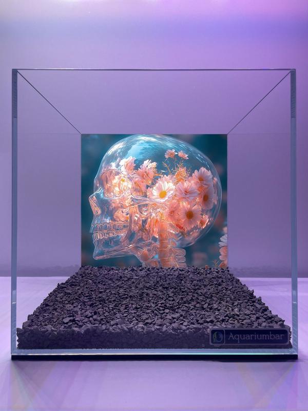 На изображении изображена прозрачная черепная коробка, заполненная светлыми цветами, внутри аквариума. Композиция изображения состоит из прозрачной черепной коробки, заполненной светлыми цветами. Череп и цветы расположены в центре изображения, а вокруг него -- темный гравий. Изображение имеет спокойную и медитативную атмосферу. Ключевым субъектом является череп, который прозрачный и украшен цветами. Цветы, наполняющие череп, создают приятную атмосферу. Внешний вид черепа очень детализирован. Изображение выполнено в цифровом формате. Стилистически оно напоминает арт- проект, выполненный с помощью специального программного обеспечения. Цветы и череп на изображении выглядят реалистично. Цветовая гамма преимущественно пастельная, с акцентами на теплых тонах. Обстановка создана с помощью светлого, спокойного фона, и темного гравия, создающего ощущение пространства и глубины. Освещение в изображении мягкое и неяркое, что подчеркивает художественный и спокойный характер изображения. Общий тон изображения очень нежный, спокойный и приятный для восприятия.