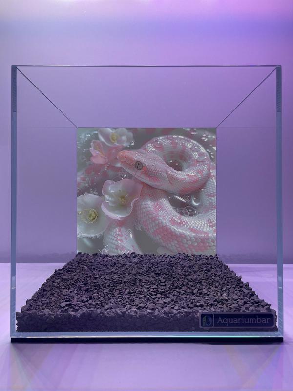 В аквариуме изображена розовая змея на фоне розовых цветов. Композиция изображения сконцентрирована на центре аквариума, где расположена змея, на фоне розовых цветов. Змея расположена в центре и выглядит естественно. Изображение, кажется, имеет яркий и эстетичный вид. Главный объект -- змея, которая имеет бледно-розовый цвет. Змея выглядит здоровой, а ее текстура гладкая. Изображение выполнено в цифровом формате с использованием специальных программ обработки изображений. Стиль фотографии является современным, со спокойными и приятными цветовыми тонами. Обстановка создана в аквариуме, который заполнен темными мелкими камнями. Цветовая гамма мягкая и расслабляющая, с преобладанием розовых оттенков, что создает умиротворяющую атмосферу. Освещение мягкое и равномерное, благодаря чему цвета выглядят насыщенными и яркими.