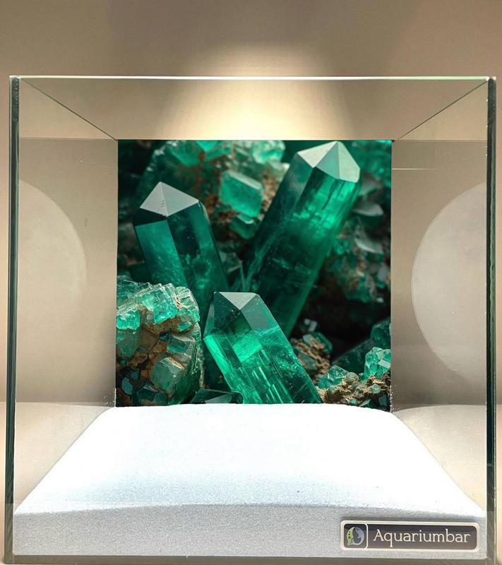 Зображення являє собою фотографію або відскановане зображення колекції кристалів смарагду, розташованих в акваріумі з прозорими стінками. У композиції переважає насичений яскраво-зелений колір, що створює ефект дорогоцінного каміння. Видно, що кристали різної форми і розмірів, розташовані на тлі, що імітує гірську породу з включеннями. Використовується нейтральне біле тло, що фокусує увагу глядача на кристалах. Стиль зображення реалістичний, з детальним промальовуванням кристалів, проте немає видимих елементів, які б вказували на конкретний художній стиль, крім реалістичного зображення. Відсутня чітка техніка нанесення або особливості, які б вказували на використання будь-яких певних художніх прийомів. Засіб відображення - фотографія.