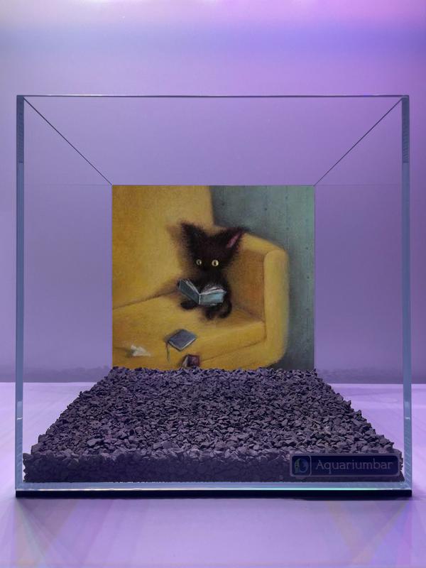 Изображение представляет собой аквариум, оформленный как миниатюрная сцена. На внутренней поверхности аквариума размещена картина, изображающая черного котенка, сидящего на желтом диване и читающего книгу. Стиль картины можно охарактеризовать как иллюстративный, с элементами реализма. Цвета на картине яркие и насыщенные, при этом цветовая гамма довольно ограничена, что создает особый настрой. В целом, композиция картины напоминает иллюстрацию для детской книги или обложку. Средствами изобразительности использованы мягкие переходы тонов и оттенков, что делает картину приятной и уютной. Техника нанесения краски не выделяется особой сложностью или выраженностью мазков, а стиль композиции не имеет явных отсылок к известным художникам или художественным направлениям. Материал, используемый для картины, скорее всего, акриловая или акварельная живопись, или цифровой арт. Визуально изображение смотрится достаточно аккуратно.