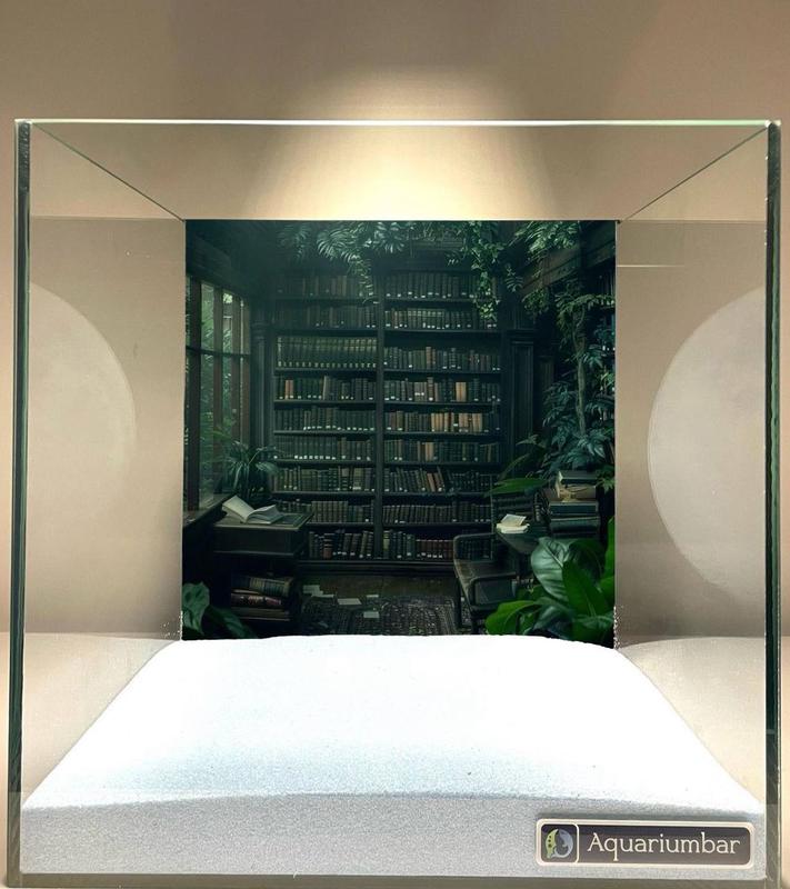 Внутри стеклянной рамки размещен натюрморт, изображающий библиотеку с полками, заполненными книгами. Композиция снимка представляет собой изображение библиотеки, вид сбоку. Внутри пространства, созданного стеклянными панелями, находится изображение библиотеки с множеством полк, заполненных книгами. В библиотеке присутствуют различные растения, а также старинные предметы мебели. Изображение представляет собой тщательно сфокусированное изображение библиотеки с фоном и передним планом, создающим впечатление пространственного размера. Изображение - это библиотека в художественной форме. В центре находится библиотека. Полки с книгами, растения и мебель занимают средний план. Фокус снимка направлен на детальное изображение множества книг на полках. Снимок создает впечатление детализации и пространства библиотеки. Изображение сделано с использованием цифровых технологий. Цвета и формы изображены с высокой степенью реализма. Используемые цвета выглядят старыми, и структура изображения не выглядит современной. На фото изображена старинная библиотека, оформленная в стиле фотореализма с использованием освещения, направленного спереди, чтобы подчеркнуть детали и текстуры. Атмосфера снимка спокойная и интимная, соответствующая атмосфере, создаваемой в библиотеке.
