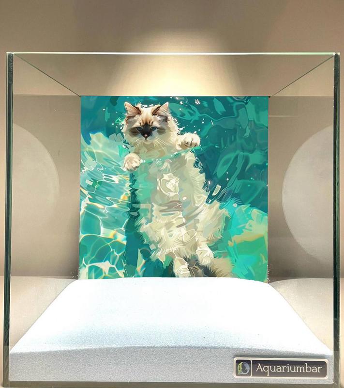 На изображении изображена картина кошки, плавающей в аквариуме. Композиция изображения представляет собой аквариум, заполненный изображением кошки, плывущей в воде. Картина изображает кошку, плывущую в воде в аквариуме, с акцентом на реалистичности воды. Представлено точное изображение кошки, которая плывет прямо в воде. Композиция изображения сосредоточена на изображении кошки в аквариуме. Изображение имеет четкую перспективу и композицию. Ключевой объект на изображении - кошка. Кошка выглядит реалистично, с пушистой белой шерстью и темно-серым оттенком на морде. Кошка расположена в центре аквариума и кажется спокойной, плавающей в воде. Изображение выполнено в стиле цифрового рисунка с акварельными цветами и оттенками. Изображение отличается использованием мягких цветов и текстур, что создает уютную и расслабляющую атмосферу. Техника изображения кошки реалистичная, а вода кажется жидкой. Изображение показывает тщательно продуманное сочетание цветовых оттенков и композиции. Среда изображения - аквариум, заполненный изображением синей воды. Освещение мягкое и равномерное. В целом, освещение создает расслабляющую атмосферу. В изображении используется свет, чтобы подчеркнуть и улучшить визуальное представление воды и кошки.