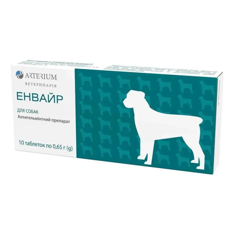 Опис Arterium Енвайр -- антигельмінтний препарат призначений для дегельмінтизації собак при нематодах, цестодах, аскаридозах, трихуроз і т.д. Випускається у вигляді таблеток різних відтінків жовтого кольору зі специфічним запахом. Як працює антигельмінтний засіб Енвайр для собак: Взаємодія фебантелу та пірантелу посилює вплив препарату на круглих хробаків -- нематод. Перша речовина викликає порушення енергетичного обміну у паразитів і вони гинуть за пару діб. Друге викликає у глистів спастичний параліч, після чого вони виводяться з організму перистальтичними рухами кишківника. Особливої уваги вимагає дегельмінтизація цуценят, оскільки зараження глистами може призвести до серйозних проблем зі здоров'ям і навіть летального результату. Для лікування антигельмінтик Arterium Енвайр застосовується за призначенням ветеринара, з урахуванням проведених обстежень, аналізів та загального стану здоров'я собаки. Профілактика гельмінтів проводиться раз на квартал. Дотримання дозування препарату та правил обробки знижує ризик виникнення побічних ефектів. Застосування: Профілактика та лікування цуценят та дорослих собак при ураженні круглими та стрічкових гельмінтів. Круглі гельмінти: Toxocara canis, Toxascaris leonina (дорослі та личинки), Ancylostoma caninum, Uncinaria stenocephala, Trichuris vulpis (дорослі). Стрічкові гельмінти: Dipylidium caninum, Taenia pisiformis, Taenia hydatigena, Taenia multiceps, Echinococcus granulosus, Echinococcus multilocularis Для застосування у ветеринарній медицині! Перорально таблетку можна приховати в кормі або безпосередньо дати собаці. Дотримання голодної дієти не потрібне. Рекомендують застосовувати пігулку перед прийманням корму. Тривалість лікування: Одноразово. За потреби повторити через два тижні. Профілактичну дегельмінтизацію рекомендується проводити 1 раз на квартал, індивідуально. Протипоказання: Не застосовувати одночасно з піперазином. Не можна застосовувати ослабленим хворим тваринам, тваринам із захворюваннями печінки. Не застосовувати вагітним самкам у перші дві третини періоду вагітності. Склад 1 таблетка (маса 0,65 г) містить діючі речовини: - фебантел, в перерахунку на 100 і суху речовину - 0,150 г - пирантел памоат (ембонат), в перерахунку на 100% і суху речовину 0,144 г - празиквантел, в перерахунку на 100 96 і суху речовину - 0,00 - Целюлоза - 102 мікрокристалічна, натрію кроскармелоза, цукор молочний, крохмаль картопляний, ароматизатор, тальк, кальцію стеарат. Застосування Рекомендована доза 1 таблетка на 10 кг маси тіла тварини. Залежно від віку і маси тіла тварин рекомендують такі дози