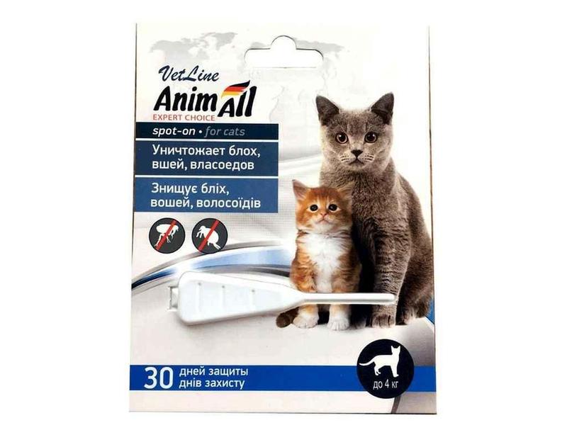 Капли AnimAll VetLine Spot-On для котов от блох и клещей на вес до 4 кгСклад:1 мл препарата содержит действующее вещество: имидаклоприд - 100 мгДоспощенных вещества: Н-метилпиролидон, ПЭГ-400.Фармацевтическая форма: Раствор для наружного применения, точечный нанесение.Фармакологические свойства:ATCvet QP53, эктопаразитициды, инсектициды и репелленты (АТС vet QP53АХ17, имидаклоприд)Имидаклоприд, действующая вещество препарата, относится к группе хлорникотиловых соединений. Блокирует постсинаптические холинергия рецепторы, которые чувствительны к никотину и находятся в эктопаразитах в центральной нервной системе. Перерывание передачи нервного импульса приводит к параличу и гибели паразита.Имидаклоприд имеет низкий уровень проникновения через гематоэнцефалический барьер, поэтому практически не влияет на ЦНС млекопитающих.Показания к применению: Профилактика и лечение собак и котов за поражение блохами (Ctenocephalus canis, Ctenocephalus felis, Pulex irrits), вшами (Linognathus setosus) волосодами (Trichodectes canis, Felicola subrostratus) и паразитиформальными клещами (Ixodes sppp., Rhipicephalus sppp. Ha, maphysalsals sppp., Dermacent spp.) и нагающий, нимфальный и личиночной стадиях развития.Протипоказания: Протипоказанием к применению является индивидуальная повышенная чувствительность животного к компонентам препарата.Не применяют больным, истощенным и ослабленным животным.Не применяют молодым животным в возрасте до 8 недель.Не применяют самкам при лактации и беременности.Побочное действие: У животных с повышенной чувствительностью к действующим веществам при применении препарата возможно раздражение кожи.Ослучающие предупреждения при использовании: При обработке животными препаратом не допускать попадания препарата в глаза, ротовую полость. После обработки животного не допускать его контакта с другими животными до полного высыхания шерсти.использование во время беременности, лактации, несучести Не применяют самкам при лактации и беременности!