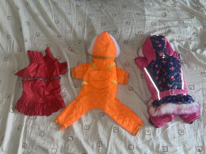 Поздравляю! Продаю одежду для собак в идеальном состоянии. На маленькие породы. За всеми вопросами к частным уведомлениям:) Оранжевый костюм для мальчика - 150 грн Розовый костюм для девочки - 200 грн Красное платье для девочки - 100 грн