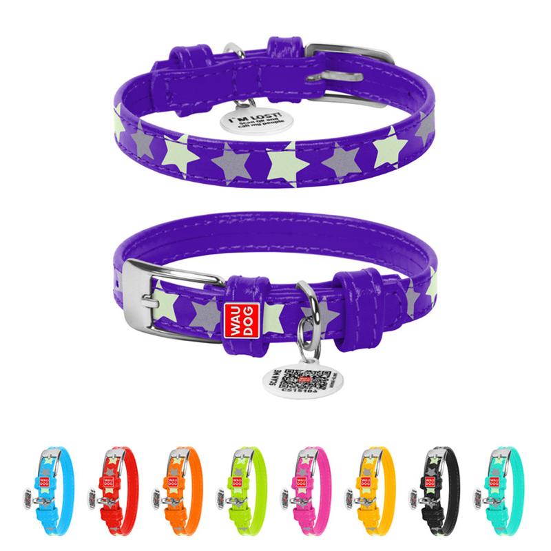 Ошейник для собак кожаный waudog glamour с qr паспортом, узор "звёздочка", светящийся/свет...