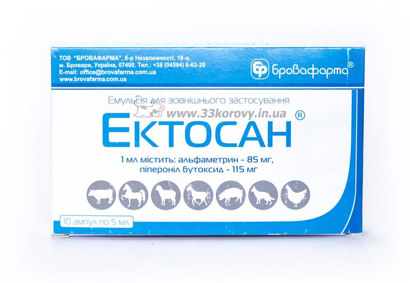 Эктосан альфаметрин 85 мг, пиперонил-бутоксид 115 мг для животных и птицы 5 мл Бровафарма Описание: Прозрачная маслянистая жидкость світло-желтого цвета с легким приятным специфическим запахом. Состав: 1 мл препарата содержит: альфаметрин - 85 мг пиперонил-бутоксид - 115 мг вспомогательные вещества: эмульгатор, стабилизующие компоненты в смеси органических растворителей - до 1 мл. Фармакологические свойства: АТС vet QP53FA03 Эктосан, состоящий из синергически действующих: альфаметрина (синтетического пиретроида) и пиперонил-бутоксида (диэтиленгликолового эфира), является контактным инсектоакарицидом, поражающим периферическую нервную систему насекомых и клещей на всех фазах их развития (личинка - имаго). Водные растворы эффективны относительно эктопаразитов животных и птиц: - акариформных клещей (семейств Psoroptidae, Sarcoptidae, Cheyletidae, Epidermoptidae); - тромбидиформных клещей (семейство Demodecidae); - паразитиформных клещей (семества Ixodidae, Argasidae, Dermanyssidae); - власоедов (семейство Trichodectidae); - малофагозов птиц (семейства Menoponidae, Philopteridae); - вшей (семейства Haematopinidae, Holopeuridae, Linognathidae); - кровососущих насекомых (семейства Muscidae, Culicidae, Simuliidae, Ceratopogonidae, Psychodidae, Tabanidae); - блох (ряд Siphonaptera); - кровососок из подотряда Pupipara (Melophagus ovinus, Lipoptena cervi, Hippobosca equina); - личинок подкожного овода крупного рогатого скота (Hipoderma bovis, H. lineatum) и эстроза овец (Oestrus ovis); - личинок и половозрелых фаз сине-зеленых и серых мясных мух (семейства Calliphoridae, Sarcophagidae) и жуков-чернотелок (Alphitobius diaperinus). Эктосантм умеренно токсичный для теплокровных животных и птиц. Относится к III классу токсичности (при оральном введении в желудок LD50 для белых крыс > 1800). Препарат токсичный для рыб и пчел. Применение.Профилактика и лечение животных (крупный рогатый скот, овцы, козы, кони, свиньи, собаки, кошки, домашняя птица) при инвазировании их эктопаразитами, чувствительными к компонентам состава Эктосанутм. Дозировка: Рабочие растворы для обработки животных применяют преимущественно методом опрыскивания с помощью разных опрыскивателей, которые способны обеспечить мелкодиссперстный поток жидкости. При наличии видимых поражений участков кожного покрова (псороптозы, саркоптозы и др.) в них втирают раствор (с помощью щеток) в течение 40-50 сек. Для мелких животных (овцы, собаки, лисицы) наиболее эффективным есть метод купания, который овцам проводят в специально оборудованных ваннах, чаще - после стрижки животных. Рабочие растворы приготавливают непосредственно перед применением путем внесения точной дозы препарата к необходимому количеству питьевой (не хлорированной) воды. Водные растворы из расчета 1:500 используют для дезакаризации животноводческих помещений (0,2 л/м2), а для дезинсекции (против мух) - 1:50. Этим раствором обрабатывают до 10% площади помещений (двери, подоконники, стены и др.). Разведения 1:750 используют для обработки животных пораженных клещами семейств Psoroptidae, Sarcoptidae, Heyletidae, Demodecidae и птиц пораженных пухо- пероедами или возбудителями сирингофилеза и др. Разведения 1:1000 применяют для животных пораженных возбудителями других видов эктопаразитов. Для одноразовой обработки применяют рабочие растворы в следующих объемах: - крупный рогатый скот, лошади - 1-3 л на животное, а для защиты от гнуса - раз в сутки в количестве 0,2-0,3 л. - свиньи - 0,5-1 л на животное; - куры, индейки - 50-60 мл на одну птицу. Гусей, уток, собак и лисиц обрабатывают методом 