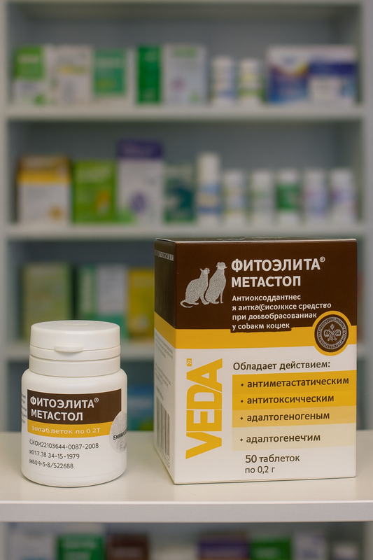 Фитоэлита Метастоп (Phytoаelita Metastop) – лекарственное средство в форме таблеток, предназначенное для детоксикации организма при новообразованиях у кошек и собак. Фитоэлита Метастоп содержит в своем составе биологически активные вещества из лекарственного сырья растительного происхождения (экстракты, отвары и настои) - 3,5% суммарно: грибов шиитаке, грибов Рейши, заростков брокколи, чаги, травы душицы травы, травы ника настоящего, травы чистотела, листья крапивы, листья березы, травы кипрея (иван-чая) узколистного, травы зверобоя, травы эхинацеи пурпурной, корня окопника шероховатого, цветков гадючника вязолистого, травы мели. корней и корневищ солодки, цветков календулы, корневищ и корней кровохлебки; а в качестве вспомогательных компонентов лактозу, крахмал и стеарат кальция. По внешнему виду Фитоэлита Метастоп представляет собой двояковыпуклые таблетки от белого до светло-желтого цвета. Допускаются вкрапления и незначительная мраморность. Выпускают Фитоэлита Метастоп расфасованным по 50 таблеткам в полимерные банки или пакеты из пищевого полиэтилена, помещенные в коробочную пачку. Банки и пакеты маркируют с указанием: организации-производителя, ее адреса, товарного знака, названия лекарственного средства, количества таблеток в упаковке, условий хранения, номера серии, срока годности, даты изготовления, надписей «Для животных», «Сырье прошло радиобиологический контроль», информацию о подтверждении соответствия, обозначении СТО. Пачки маркують із зазначенням: організації-виробника, її адреси, товарного знаку, назви лікарського засобу, його складу, призначення і способу застосування, кількості таблеток в упаковці, умов зберігання, номера серії, терміну придатності, дати виготовлення, написів «Для тварин», «Сировина пройшло радіобіологічний контроль», номери державної реєстрації, відомості про підтвердження відповідності, штрихового коду, позначення СТО і постачають інструкцією по застосуванню. Фитоэлита Метастоп хранят в упаковке организации изготовителя в сухом, защищенном от прямых солнечных лучей месте при температуре от 0°С до 25ºС. Срок годности лекарственного средства при соблюдении условий хранения – 1 год со дня приготовления. Запрещается использовать Фитоэлита Метастоп по истечении срока годности. Фармакологические свойства Механизм действия лекарственного средства определяется фитотерапевтической активностью биологически активных веществ экстрактов, отваров и настоев из лекарственного растительного сырья, обладающих иммуностимулирующими, адаптогенными, антиоксидантными, антитоксическими свойствами. Полисахариды, содержащиеся в грибе шиитаке, в том числе лентинан (С6Н10О3)n, проявляют противоопухолевую и антиметастатическую активность. Канцеростатический эффект лентинана является в основном результатом активации выработки перфорина. D-глюкан связывается с поверхностным слоем лимфоцита или специфическим сывороточным белком, который активирует макрофаги, Т-клеток, NK-клетки и другие эффекторные клетки. Это приводит к увеличению продукции антител, интерлейкинов (IL-1 и IL-2) и интерферона (IFN). Полисахарид KS-2 также обладает противоопухолевыми свойствами за счет индукции интерферона и стимуляции Т-лимфоцитов. Полисахарид ланофил, содержащийся у гриба Рейши, предотвращает рост и метастазирование 