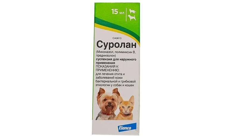 Суролан (15мл) ушные капли для собак и кошек (15 мл) Состав: 23 мг миконазола нитрата, 0,5293 мг полимиксина В сульфата, 5 мг ацетата преднизолона А также кремния диоксид коллоидный, жидкий парафин. Препарат применяется для лечения отитов различной этиологии (паразитарной, бактериальной, грибковой) у собак и кошек. Суролан представляет собой жидкость со специфическим запахом, прозрачную, консистенции сиропа. Входящий в состав препарата миконазола нитрат позволяет бороться с грамположительными бактериями, оказывать противогрибковое действие. Грамотрицательные бактерии чувствительны к полимиксина В сульфату, который также производит бактерицидный эффект. Противозудный эффект и противовоспалительное действие оказывает ацетат преднизолона. Применение препарата Суролан должно осуществляться только по рецепту, в рекомендованных дозах. Препарат Суролан является умеренно-опасным веществом по степени влияния на организм. Показания к применению: Суролан используется для лечения отитов, вызванных грамположительными (Staphylococcus spp., Streptococcus spp.) и грамотрицательными (Pseudomonas spp., Escherichia coli) бактериями, ушными клещами типа Otodectes cynotis, а также грибками и дрожжами типа Microsporum spp. или Trichophyton spp. Состав препарата обеспечивает противозудное действие. Воспаление паранальных желёз также лечится с помощью этого средства. Способ применения и дозировка: Дважды в день закапывать по 3-5 капель в каждое ухо животного. Если повреждены участки кожи, то капли необходимо наносить на поврежденное место также дважды в день. Использование препарата не должно прекращаться, если исчезли симптомы, когда животное заражено отитом бактериальной или грибковой этиологии. Иногда курс лечения может достигать 3 недель. При отсутствии симптомов выздоровления, необходимо связаться с ветеринарным врачом. Отодектоз лечится путем закапывания пяти капель препарата на протяжении двух недель. Если заражение наблюдается в одном ухе, лечение необходимо проводить в оба. Противопоказания: Перфорированные барабанные перепонки. Наличие чувствительности к составу препарата. Условия хранения: Хранить в закрытой упаковке, в сухом, защищенном от солнечных лучей месте, при температуре от +5 °С до +25 °С. Не хранить с пищевыми продуктами. Производитель: Янссен Энимал Хелс (Бельгия)