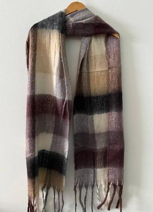 Тёплый шарф с длинными кисточками в коричневую клетку