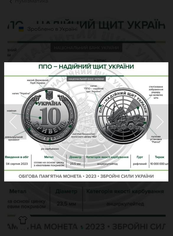 Монета «ППО – надежный щит Украины» 2023 в капсуле серия ЗСУ Памятная монета “ППО – надежный щит Украины”, посвященная противовоздушной оборотной Украине. На сегодняшний день противовоздушная оборотная Украины является чрезвычайно важным элементом безопасности военных и гражданских объектов Украины и весомой составляющей системы национальной безопасности страны. Каждый день силы противовоздушной обороны, к которым относятся воины зеленых ракетных ракетных войска Воздушных Сил, Супратных войска и Военно-Морских Сил, авиации и радиотехнических войсках Воздушных Сил Оружейных Сил Украины, другие подразделения противовоздушной обороны сил защиты Украины с начала полномасштабного вторжения в Украину верно и героически отражают воздушные атаки враждебных ракет и дронов. На аверсе монеты размещены: вверху – малый Государственный Герб Украины, в центре, в обрамлении древнерйского орнамента надписи: УКРАИНА/10/ГРИВЕНЬ (полуколом), на фоне орнамента: год карбирования монеты – 2023 (внизу) и логотип Банкнотно-монетного двора Национального банка Украины (правошко). На реверсе монеты размещено изображение пусковой установки “Patriot”; стилизованное изображение радара, открывающего цель; по кругу надпись: ППО – НАДЕЖНЫЙ ЩИТ УКРАИНЫ (вверх). Номинал: 10 грн Дата выпуска: 04.08.2023 Художник: Демяненко Владимир; Дизайн - Балута Тетяна Скульптор: Демяненко Владимир Тираж (объявленный), шт: 10000000 Стан: Идеальный Цвет: Серый Категории: НумизматикаАнтиквариат и коллекции Сделано в Украине? Производство Регион происхождения Украина