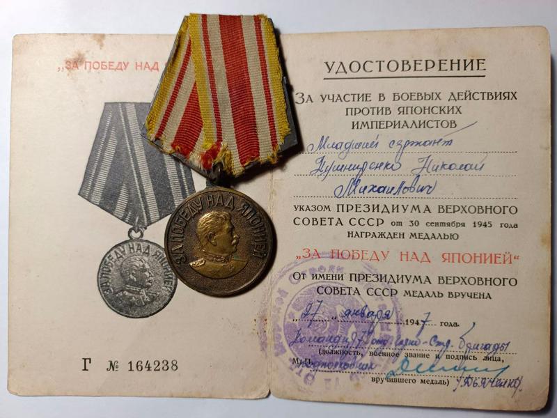 Медаль с документом за победу над японией