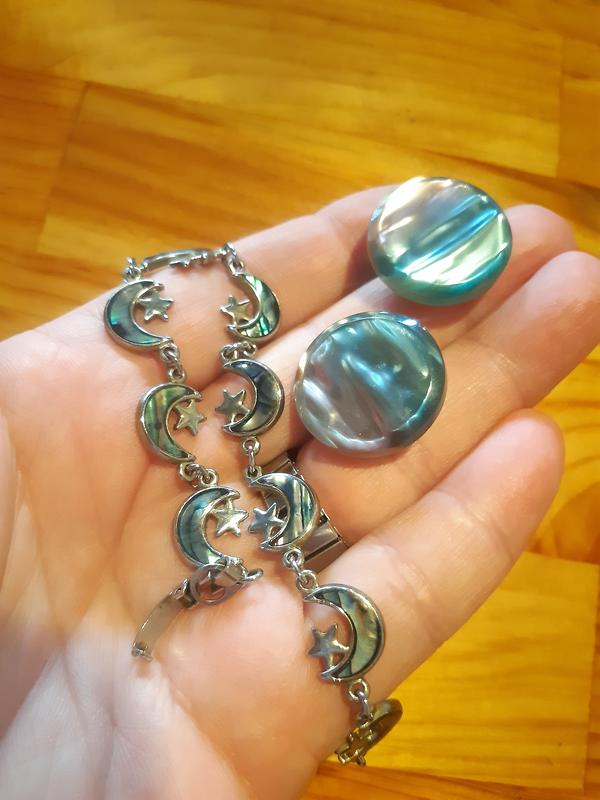 Набір сет кліпси люцит, браслет місяць зорі аболон геліотіс мушля хеліотіс вінтаж