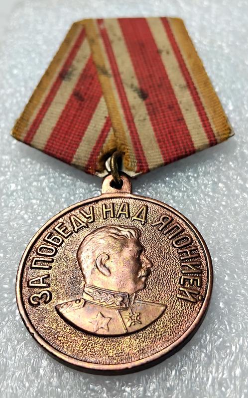 Медаль 'За победу над Японией' диапазона 1946г. ('ушко лопата') лента родная муаровая,прижимная планка не отжималась. ☝️Медаль изготовлена из бронзы,как правило подобные медали изготовлялись из латуни.