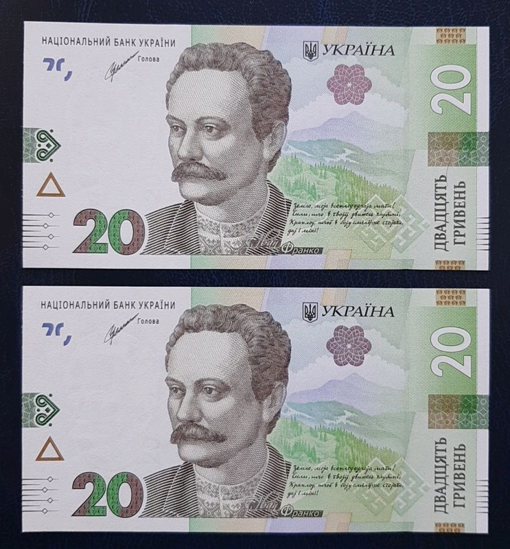 Тип: Банкноти України 20 гривень 2021 2 бони, номери поспіль Бона в ідеальному стані (UNC), по фото К.Шевченко Серія ЕЖ 1897360...61