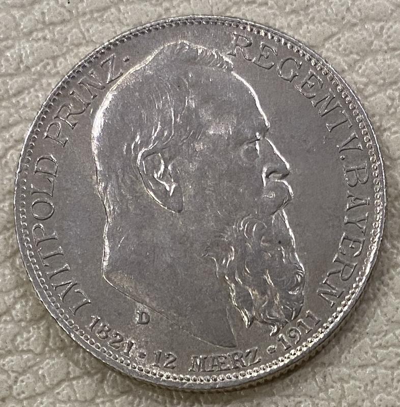 2 марки 1911 90 лет со дня рождения Луитпольда Баварского Немецкая империя Серебро 0.900