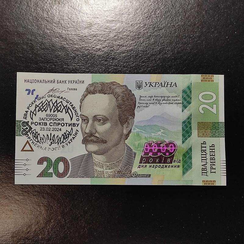 Банкнота 20 гривень ЦБ*********** років Франко спецпогашення штамп 10 років спротиву (Два роки широкомасштабного вторгнення росії в Україну) 23.02.2024 року, місто Запоріжжя. Купюра нова, з банківського пресу.