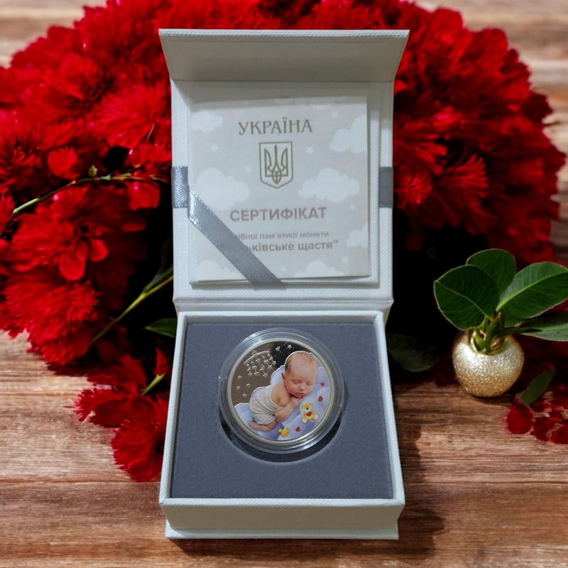 Памятьная монета “Батьковское счастье” посвящена самому дорогому в жизни – счастью быть родителями, трепету первых объятий и безусловной любви к малышу. На аверсе монеты на зеркальном фоне размещены композиция: родительские руки, которые ласково держат ножки младенца, символизирующий доверие, ощущение защиты и любовь, которая соединит семью (по центру); надпись УКРАИНА (воре по центру), под которым малый Государственный Герб Украины, номинал 5 и графический символ гриви (лево от рук) и внизу по центру – год карбирования монеты 2024 (нуле изображено в форме сердца). На реверсе монеты на зеркальном фоне изображено детишка, который мирно спит на мягких тучках среди игрушек (элемент отделки – тампопечать). Погремушка, сияющая на фоне ночного неба, словно луна, дарит ощущение спокойствия и уюта. Оно освещает путь ребенка в мир грез и фантазий, даря беззаботные сны. Художник: Яровый Владислав Скульптор: Атаманчук Владимир Тираж (объявленный/фактический), шт: 15000/5000 Масса драгоценного металла в чистоте, г: 15.55 Диаметр, мм: 33 Категория качества карбирования: специальный анциркулейтед Гурт: гладкий с углубленной надписью