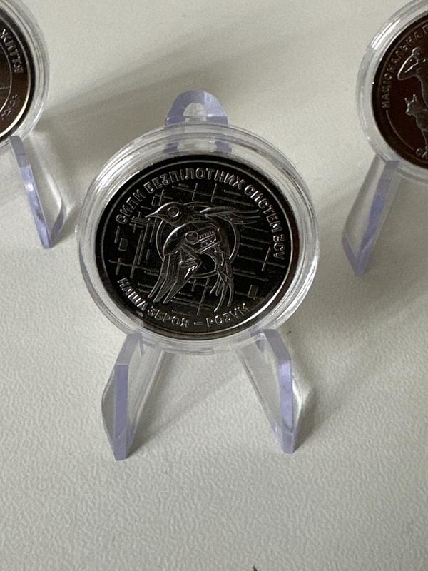 Монета сбс (сили безпілотних систем) в капсулі на підставці.