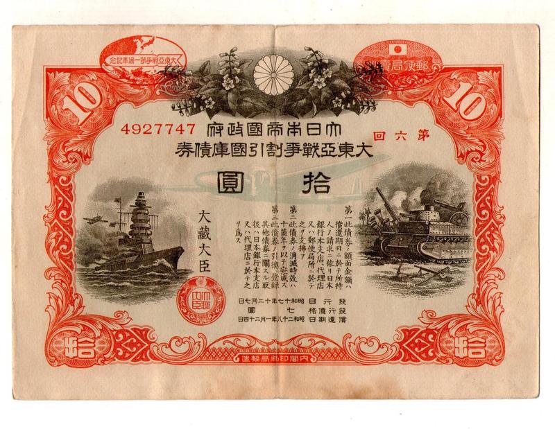 Японія цінний папер військовий займ 10 йєн 1941-1945 рік гарний стан №136