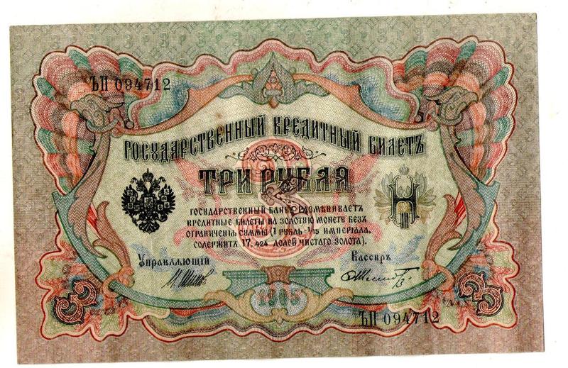 Державний кредитний білет 3 рублі 1905 рік управл.шипов ьп 094712