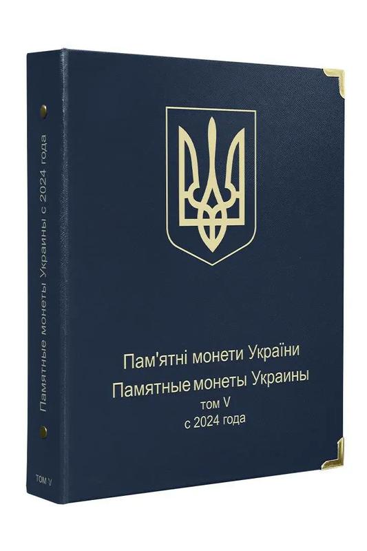 Выпущенные ранее издания охватывают все памятные монеты, начиная с 1995 года по настоящее время. Пятый том включает место для медно-никелевых и биметаллических юбилейных монет Украины с 2024 года. Все монеты расположены по хронологии, а каждая из ячеек подписана на украинском языке. Пока в альбоме 1 лист, но в будущем, по мере выпуска новых монет он будет дополняться и новыми листами (которые также можно будет приобрести отдельно). Характеристики и свойства "Альбома для юбилейных монет Украины том V c 2024 года": Цвет альбома для монет: синий. Герб на альбоме: герб Украины. Количество листов в альбоме: 1 лист (при необходимости, листы легко убираются и добавляются). Максимальное количество листов с дополнительными: 12 листов. Переплет: болтовое соединение на три болта в каркасе из пластика. Отделка углов: металлическими уголками золотого цвета. Формат альбома: 215х260 (мм). Размер листа: 205х250 (мм). Цена указана за альбом с футляром Новый, без монет.