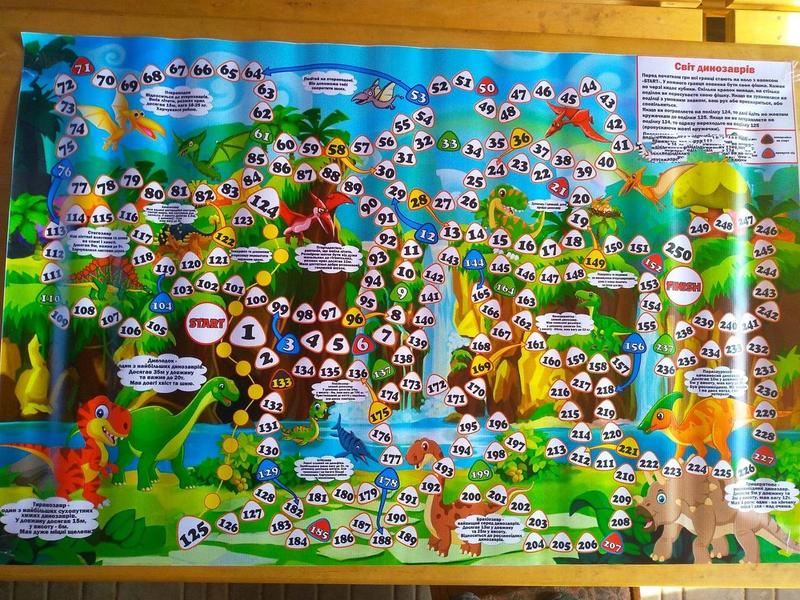 Гра - бродилка 200*300 см Це сімейна гра, яка поверне Вас у дитинство.Ігрове поле виготовлено з міцної банерної ПВХ тканини, яка не боїться води, не стирається та тримає форму на різних поверхнях. Гра розвиває моторику, логічне мислення, зміцнює командний дух.Гравці за черзі кидають кубик і ходять в напрямку, зазначеному стрілками. Виграє той, хто першим добереться до фінішу. На дорозі до фінішу гравців чекають різноманітні перешкоди, які можуть змінити напрямок руху.В комплект входять шість фішок та два кубика, що дає змогу грати як у двох, так і великою компанією.В наявності 6 видів: - мультяшні динозаври - справжні динозаври - феї - всесвітня подорож - подорож краплинки води - морська подорож Гра відправляється в рулоні та пакується в картонну транспортну коробку. Полотна довші за 120 см відправляються лише на вантажні відділення!!!