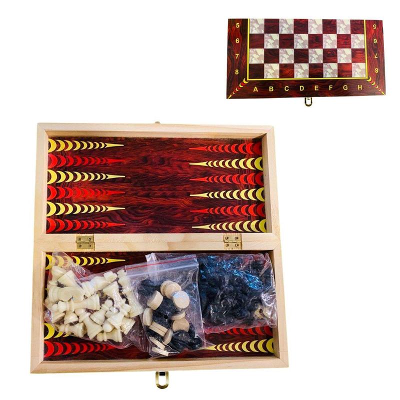 Деревянный набор 3в1, в который входит 30 шашек, 32 шахматные фигурки и бросальный кубик. Этот набор ни за что не даст Вам заскучать. Ведь с ним вы можете играть сразу в 3 игры: Шахматы, Шашки и Нарды.