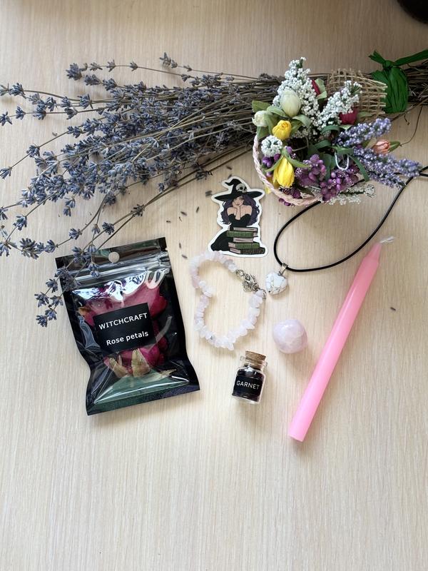 Цей ніжний набір створений для практик самопідтримки, сердечного зцілення, відкриття любові до себе та світу. Склад набору: Рожева свічка: символ м'якої, безумовної любові, краси й ніжності; допомагає розкрити серце та наповнити простір теплом. Браслет із рожевого кварцу: талісман любові, ніжності та внутрішньої гармонії; підтримує емоційне зцілення й глибокий душевний спокій. Рожевий кварц (натуральний круглий камінь): посилює наміри любові, турботи й самопрощення; чудовий супутник для медитацій і ритуалів. Гранат (камінці в колбі): камінь пристрасті, сили й життєвої енергії; додає внутрішнього вогню й допомагає рухатися вперед із відкритим серцем. Бутон сушеної троянди: вічний символ любові, краси й духовної чистоти; додає тонкого аромату й чарівності до будь-якої практики. Кулон у формі серця: знак відкритості, довіри й сили почуттів; супроводжує в щоденних практиках і нагадує про істинну цінність себе. Рекомендації щодо використання: Запаліть рожеву свічку, тримаючи в руках рожевий кварц або браслет. Промовте намір любові й зцілення. Використовуйте бутон троянди в обрядах або як прикрасу на вівтарі. Носіть кулон-серце як щоденне нагадування про силу вашої душі та серця. Приклад запиту: "Я люблю себе безумовно. Моє серце відкрите для радості, світла й найкращих благословень у житті."