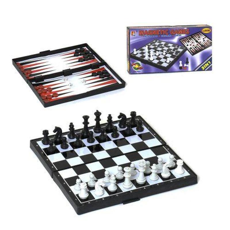 Уценка. (неплотно открывается) Набор "3 в 1". В наборе есть 3 игры: шахматы, шашки и нарды. Доска с металлическим покрытием. Фигуры выполнены из пластика и оснащены магнитом, что фиксирует фигуру на игровом поле. Выполнен из качественных и безопасных материалов. Упаковка: Коробка Цвет: Разноцветный Габариты в упаковке: 12 x 24 x 4 см Cтрана производитель: Китай Материал: Комбинированный Комплектация: Шахматы, шашки, нарды