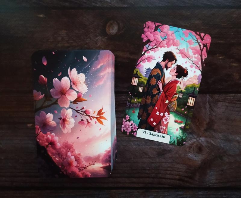 Сакура Таро, 78 карт. Размер 7 см х 12 см. Надписи на картах на украинском языке. Карты премиум-качества из плотного картона. Покрытие карт - глянцевая ламинация. В набор входит полная колода 78 карт, картонная коробочка и мешочек из бархата
