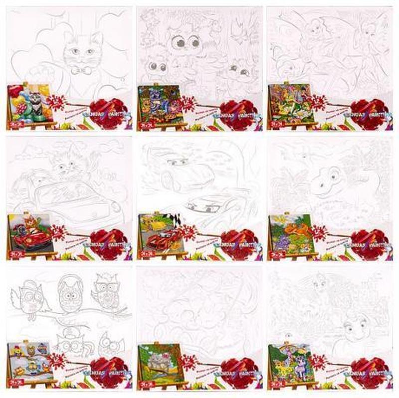 Роспись на холсте - раскрашивание "контурных картин" красками, холст на подрамнике, размер 31х31см, 12 акриловых красок, кисть, картинки в ассортименте. Возраст 8+