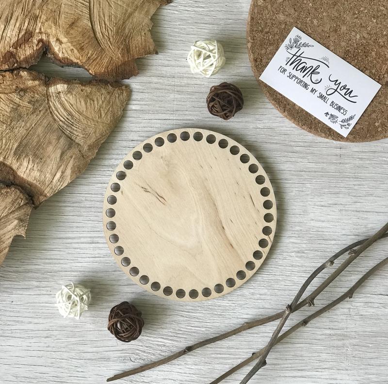 Фанерные донышки применяются как основа для изготовления вязаных изделий из трикотажной пряжи или шнура. Толщина заготовки 4 мм. Диаметр отверстий под обвязку: 8 мм. Все заготовки светлого цвета, можно покрыть заготовку лаком, краской, морилкой для дерева.