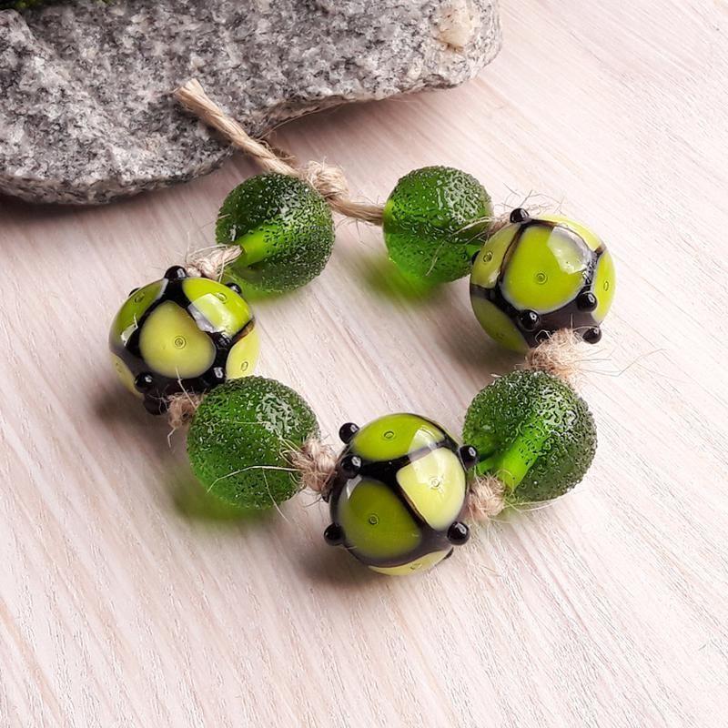 Набор стеклянных бусин ручной работы для создания украшений. Три бусины с геометрическим мотивом дополнены бусинами приятного зеленого цвета с ′сахарным′ декором. Стеклянные бусины в технике лэмпворк создаются вручную в открытом огне. Бусины проходят отжиг в муфельной печи для придания прочности. Размер бусин: Зеленые на черном - 16х13 мм Сахарные - 13 мм Диаметр отверстия 2 мм Цена указана за набор из 7 бусин.