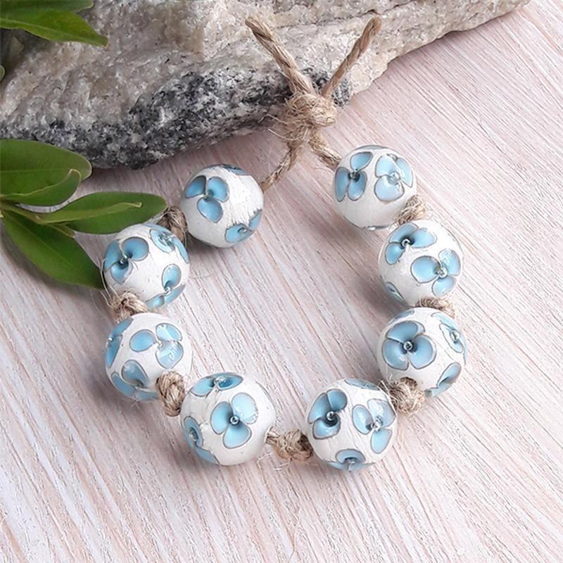 Набор из 8 стеклянных бусин для создания украшений. В каждой бусине по четыре голубых объемных цветочка на молочном фоне (цвета светлой слоновой кости). Бусины в технике лэмпворк создаются вручную из итальянского стекла в открытом огне. Бусины проходят отжиг в муфельной печи для придания прочности. Диаметр бусин ~ 1.3 см (меньше чем на фото) Диаметр отверстия 2 мм. Товар под заказ
