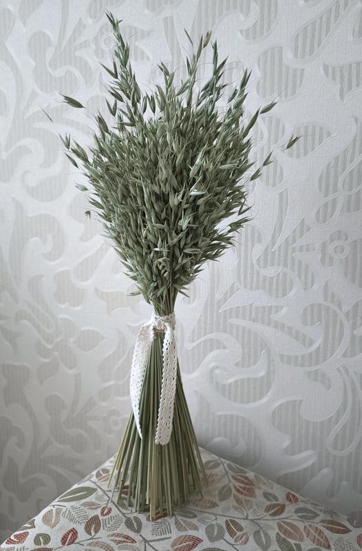 Снопык овса в натуральном зеленоватом цвете. Красиво просушенный. Стоимость указана за 110 колодоков. Урожай 2025 года. Получите именно то, что на фото, вместе с хлопковой лентой. Высота - 45см.