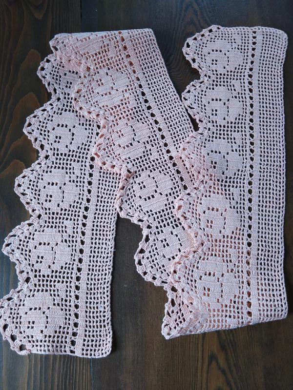Мереживо ру,чної роботи. Плетена гачком технікою "філе". На жаль фото не зовсім передвє дійсний колір. Він, як кажуть"лососевий". Довжина 108 см. Ширина 11 см. Для оздоблення рушників, фіранок, тощо.