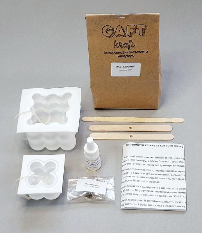 Менеджер быстро отвечает! Заказ отправляем в тот же день! Мы создали набор для создания идеального подарка своими руками! Набор для создания соевых свечей в мегапопулярной форме. Теперь и вы можете на этом заработать! В наборе: - 200 г соевого воска (США) - силиконовая форма Нео куб 6*6*6 см - силиконовая форма Нео куб 4*4*4 см - хлопковая нить (фитиль) 15см + 10 см - отдушка Германия - краситель Кстати, это отличный подарок для рукоделий, детей и подростков! Как сделать свечу из соевого воска? Чтобы топить хлопья воска, воспользуйтесь обычной водяной баней -- двумя кастрюльками разного размера. В посуду большего диаметра наливается вода. Кастрюля отправляется на огонь. В емкость меньшего диаметра выкладывается соевый воск. Дайте соевому воску расплавиться, периодически помешивая его до полного исчезновения комков. Не нужно варить массу до закипания. Более того, не допускайте ее нагревание свыше 85 C. Идеально -- снять кастрюлю с огня, как только воск "поплывет". Остается в теплую смесь добавить краситель и аромат. Расплавленный соевый воск смешивают с красителем и ароматическим компонентом при температуре 55-65 C. Сразу после перемешивания компонентов можно заливать воск в формы. То есть температура заливки равна 55-65 C. Когда аромасвечи застынут, их нужно оставить в состоянии покоя на трое суток. За это время воск окончательно застынет, и формовая свеча из соевого воска будет готова к использованию. В наличии также: • Набор для создания 4 соевых свечей с ковшиком и термометром • Набор для создания 2 соевых свечей с ковшиком • Набор для создания 2 кокосовых свечей с ковшиком • Набор для создания 2 массажных свечей с колбой в железных баночках