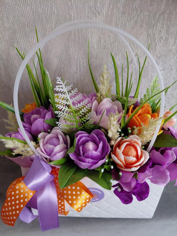 Букеты в корзине изготовлены из качественной мыльной основы. разные размеры, разные ароматы. Есть наличие и под заказ.