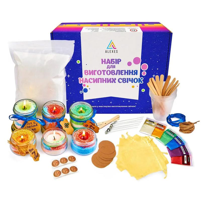 Набор для изготовления насыпных свечей: Этот набор позволяет вам создать яркие насыпные свечи своими руками и оригинально оформить их для подарков или собственного использования. Парафин (1 кг): Высококачественный парафин, который используется для создания основы свечей 2. Банки для свечей (100 мл с крышками - 3 шт, 330 мл с крышками - 3 шт): Компактные и среднего размера банки с крышками для формирования свечей. 3. 6 цветов перламутровых пигментов по 2,8 г: Набор перламутровых пигментов для придания свечам красивого и мерцающего вида. 4. Фитили армированные с держателями (6 шт): Специальные армированные фитили с держателями для стабильного положения в свече. 5. Держатели для центрирования фитилей (2 шт): Удобные деревянные держатели для точного центрирования фитилей в свечах. 6. Мешочки из органзы для упаковки готовых свечей: Декоративные мешочки для удобной и красивой упаковки готовых свечей. 7. Шпагат (2 метра): Шпагат для оформления и украшения готовых свечей. 8. Лента атласная (2 метра): Атласная лента для оформления и украшения готовых свечей. 9. Бирки крафтовые (6 шт): Крафтовые бирки для обозначения цветов, ароматов или других характеристик свечей. 10. Наклейки на банки (6 шт): Специальные декоративные наклейки для украшения ваших готовых изделий. 11. Стаканы одноразовые пластиковые 250 мл (6 шт): Пластиковые стаканы для смешивания различных цветов пигментов с хлопьями парафина. 12. Палочки деревянные для смешивания (10 шт): Деревянные палочки для смешивания пигментов и равномерного распределения цвета в восковой массе. 13. Мешочки из органзы (6 шт). Инструкция для создания насыпных свечей с помощью нашего набора: Шаг 1: Подготовка рабочего места Убедитесь, что ваш рабочий стол чист и свободен от любых лишних предметов. Защитите рабочую поверхность газетами или пленкой, чтобы избежать загрязнения. Шаг 2: Подготовка материалов Распакуйте набор и разместите все материалы перед собой. Проверьте, все ли компоненты из набора присутствуют. Шаг 3: Использование парафиновых гранул Измерьте необходимое количество парафиновых гранул для каждого цвета свечи. Воспользуйтесь пластиковыми стаканчиками из набора. Шаг 4: Добавление перламутровых пигментов Выберите цвет и добавьте в стакан с парафином перламутровую пудру, не торопитесь, выбирайте интенсивность в процессе смешивания. Хорошо перемешайте для получения равномерного цвета. Шаг 5: Подготовка банок и фитилей Разместите банки на рабочей поверхности. Вставьте армированные фитили в держатели и разместите их в центре каждой банки. Воспользуйтесь клейкими стикерами для фиксации фитиля по центру дна банки. Используйте держатели для центрирования фитилей, чтобы обеспечить их стабильность. Шаг 6: Наполнение банок Осторожно насыпьте пигментированный парафин в банку, оставляя примерно 1-2 см от верха. Ваша свеча почти готова! Шаг 7: Подписание и оформление бирок. Подпишите бирки по своему усмотрению. Прикрепите к банкам, используя ленту или шпагат. Добавьте на банки декоративные наклейки. Шаг 8: Упаковка готовых свечей Закройте крышку и положите готовую свечу в мешочек из органзы. Порадуйте ваших близких оригинальными теплыми подарками, сделанными своими руками.