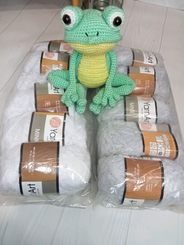 Пряжа мінк пухнаста підходить для в'язання гачком і спицями,жабка не входить,в наявності 6мот білої і 6мот сірої,метраж і номер коліру на фото, ціна вказана за 1моток.