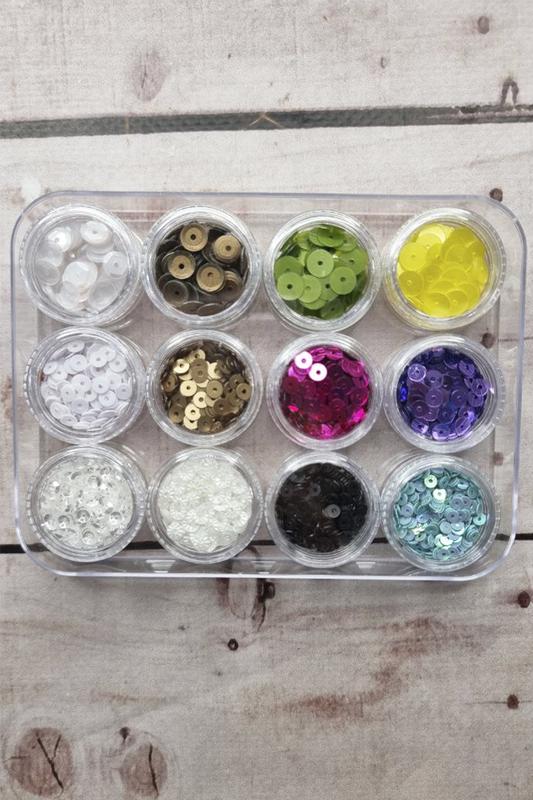Пайетки для украшений, рукоделия и творчества. Набор пайеток для создания украшений содержат 12 отдельно открывающихся баночек и органайзер с крышкой для хранения. В набор входят пайетки разных цветов и разного диаметра. Каждый вид по 1,2 г.