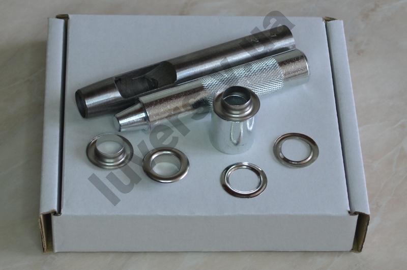 Набор для установки люверсов 12 мм. В набор входит развальцовщик люверсов, пробойник отверстий и нержавеющие люверсы в количестве 100 штук. Внутренний диаметр люверсов 12мм наружный - 20,5мм, высота ножки 6 мм.